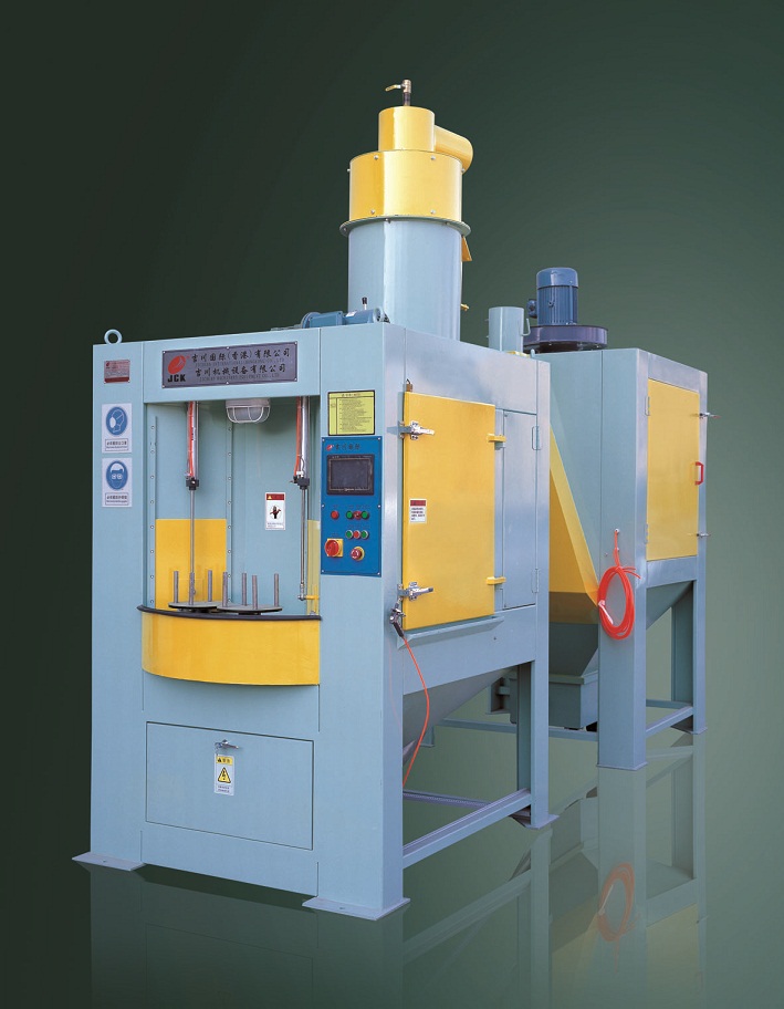 本設(shè)備是根據(jù)我公司針對(duì)轉(zhuǎn)動(dòng)軸和處理要求而專門設(shè)計(jì)的轉(zhuǎn)盤式自動(dòng)噴砂機(jī),完全適合貴公司所提供的產(chǎn)品。根據(jù)貴公司對(duì)產(chǎn)品效率的要求,本機(jī)共大轉(zhuǎn)盤共設(shè)置4個(gè)區(qū)域(90度一個(gè)區(qū)域),每個(gè)區(qū)域設(shè)置2個(gè)工件裝夾工位。大轉(zhuǎn)盤每轉(zhuǎn)動(dòng)90度區(qū)域一停,噴砂區(qū)域內(nèi)共布置12支普壓高速噴砂槍,在噴砂區(qū)1個(gè)區(qū)域 2個(gè)噴砂加工位,各布置6支噴砂槍對(duì)工件需噴砂部位做擺動(dòng)噴砂加工,噴槍可根據(jù)加工需要,隨意調(diào)整其噴射角度,其自動(dòng)化程度較高。 該機(jī)由主機(jī)、旋風(fēng)分離器、除塵箱、抽風(fēng)管道、空氣壓縮系統(tǒng)(客戶自備)、電氣系統(tǒng)等組成。本機(jī)配置12支普壓高速噴砂槍,根據(jù)工件的大小可擺動(dòng)噴砂,也可定點(diǎn)噴砂,靈活方便實(shí)用。 |